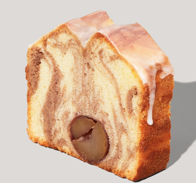しっとりした食感にこだわったプレーン生地とペースト状にした甘栗を加えたマロン生地をマーブル状に仕上げ、中心に栗の甘露煮を入れています。トッピングのシャリシャリとしたシュガーグレーズの歯ごたえが、食感のアクセントになっています。
