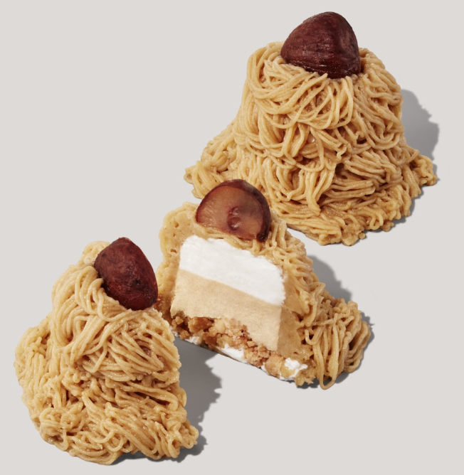 サクサク食感のホワイトチョコレート味のクランブルに、なめらかなマロンムースとミルキーなホイップクリームを重ね、コクのある濃厚な味わいのマロンペーストで包みました。マロンペーストは、手作業でひとつずつ丁寧にしぼり、大粒のマロンをトッピングしています。